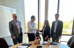 Bonnie Drozdowski and Robert Obenaus-Emler shake hands to commemorate the signing of the MOU. Left toright: Tom Whalen, Robert Obenaus-Emler, Bonnie Drozdowski, Martin Huard.